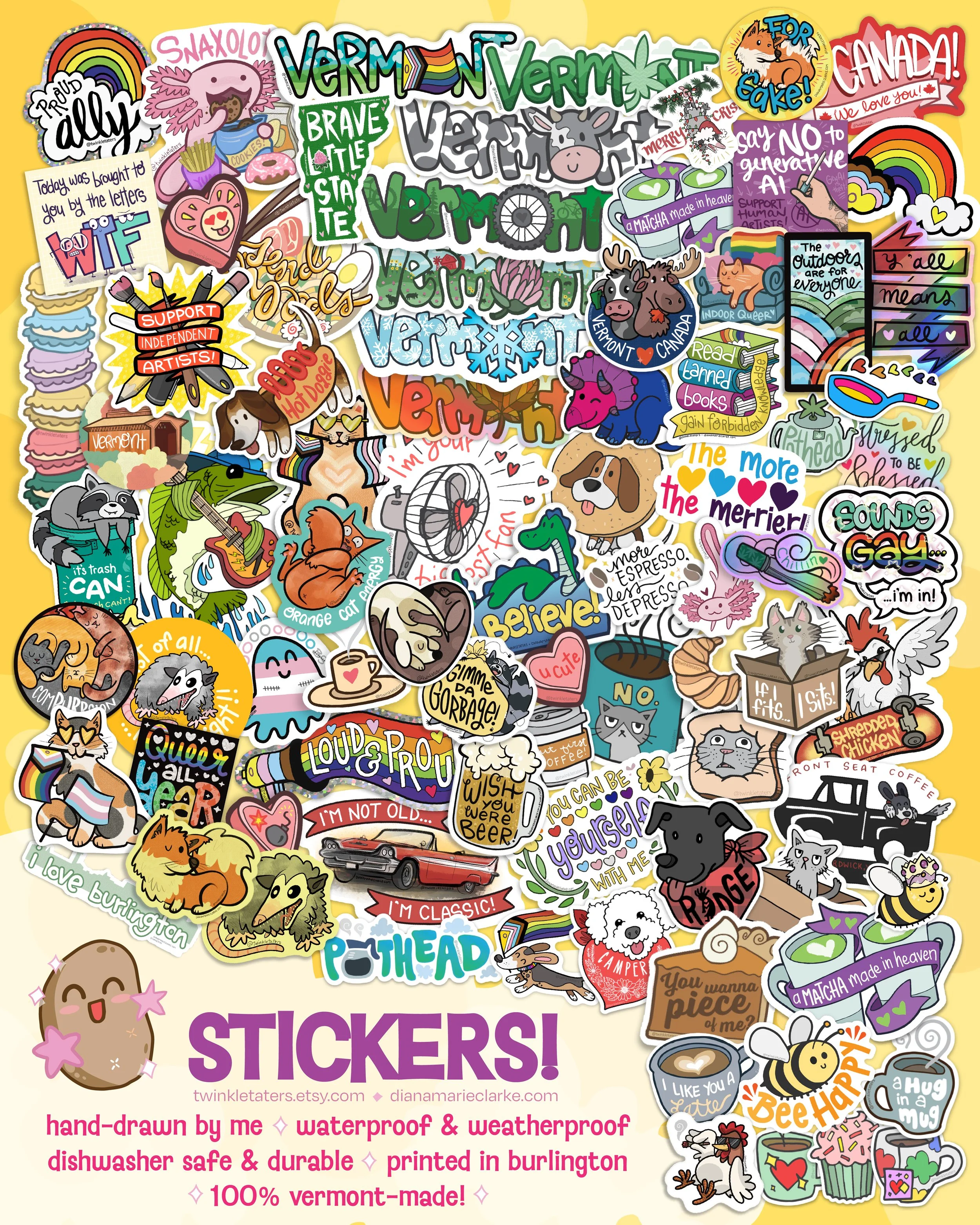 All of my stickers are brainstormed, drawn, created, and produced in Vermont! My designs start as pen and ink drawings by me, from my sketchbook... no AI or Canva to be found here. These are my original illustrations! I then finish the design in Adobe Photoshop and Illustrator, and send my finished design to be produced/printed by The Sticky Brand, who is an environmentally conscious custom sticker company based locally (for me) in South Burlington, VT.